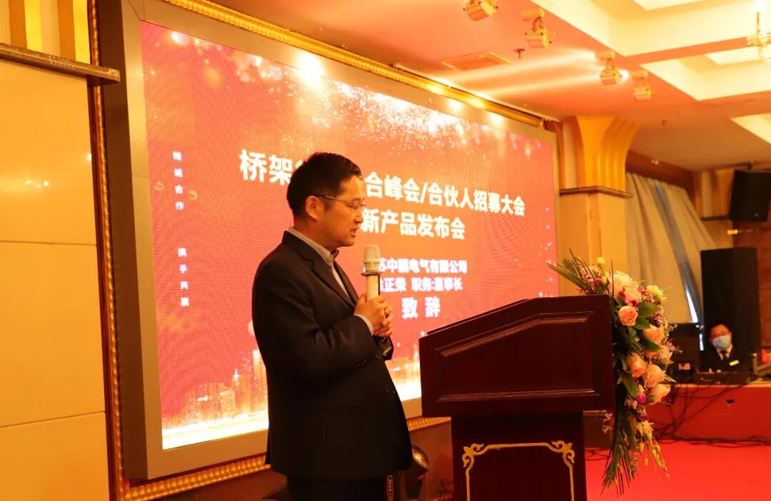 致辞中徐正荣董事长向与会嘉宾详细阐述了本次江苏中鹏电气有限公司发布的新产品“轻型节能模压高强电缆桥架”的发展史以及本行业未来的发展趋势。徐董事长表示“本次盛会,江苏中鹏电气有限公司与八方宾朋共品新品,我们愿跟同行分享我们的经验,我们愿跟同行一一起成长,一起探讨未来”。